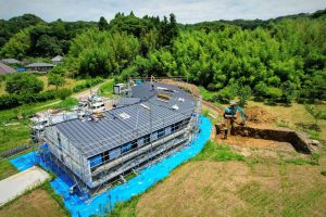 外部ではプールの工事が進んでいます。今回はフランスのマジライン社のプールで、底版の配筋と樹脂製の型枠を兼ねた壁パネルの組立が進んでいます。来週には樹脂型枠内と底版のコンクリート打設を予定しています。