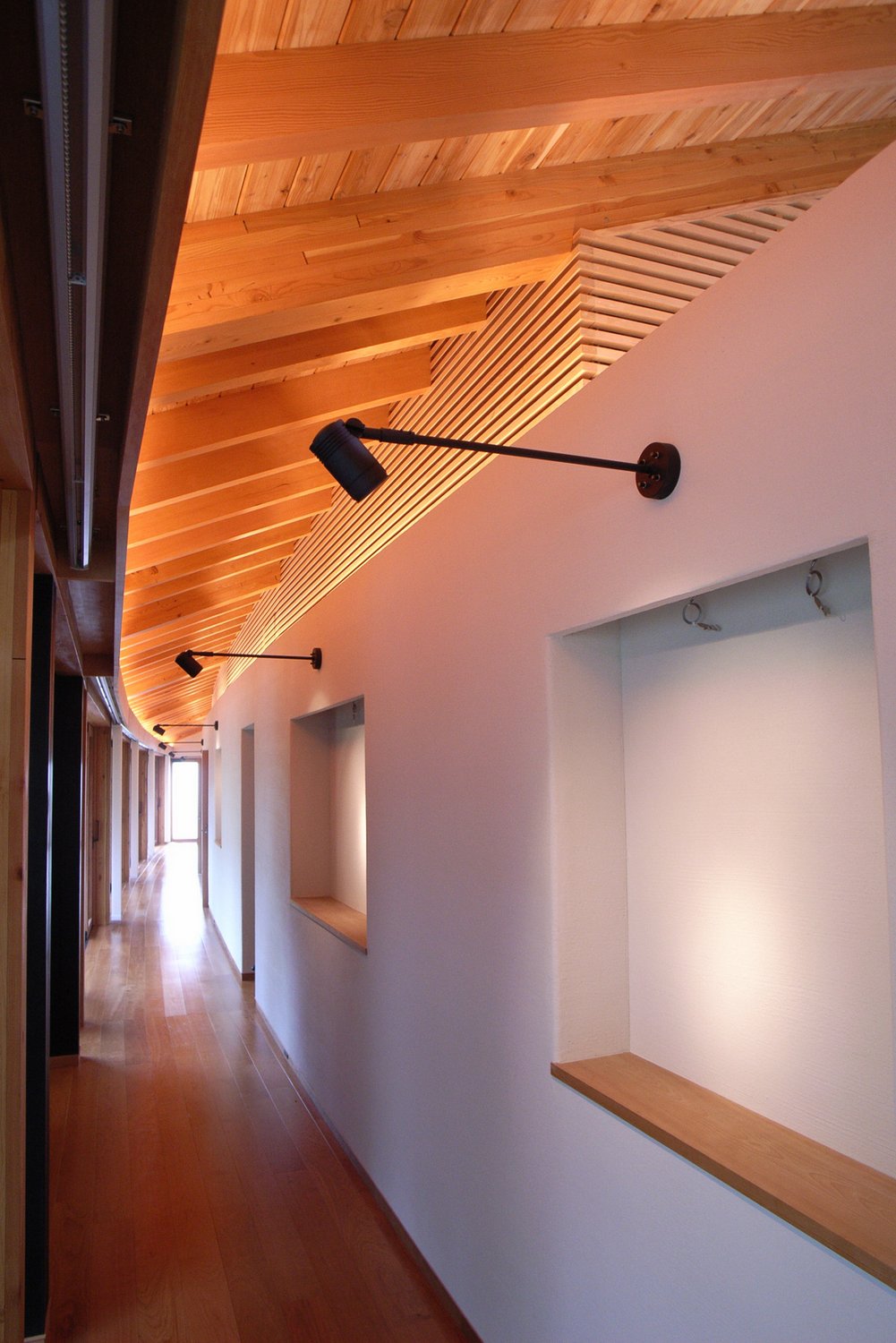 エントランスドアを開け寒緋桜の植わった中庭を見ながらエントランススペースを下ると、テンションロッドの連続する屋根架構が特徴的なギャラリーに導かれます。ゆったりとした幅員を確保した廊下を兼ねたギャラリーには、絵画を展示するためのスペースとしても利用されます。