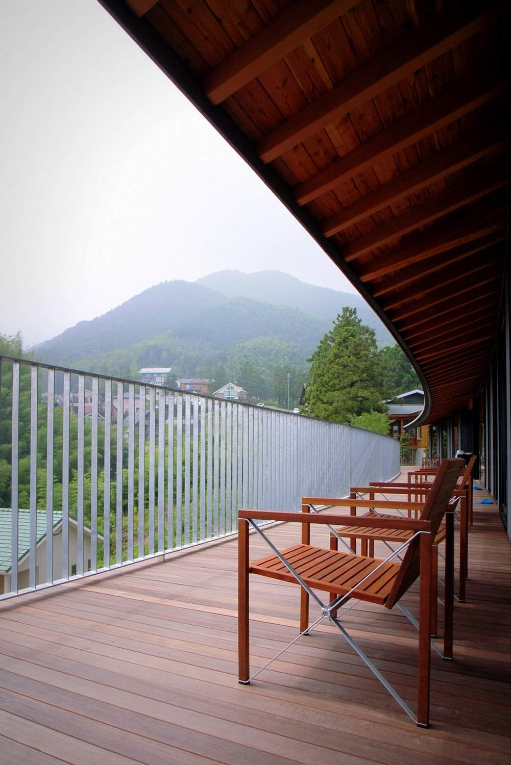 傾斜地の細長い敷地形状に合わせ、長さ約40mのゆるやかな弧を描く平面形が、連続するトップライトを持つ切り妻の瓦屋根によって覆われています。眺望の確保と、高いレベルで接道する前面道路との関係から、建物本体はピロティー形式の高床構造となっており、ずべての部屋はゆったりとした奥行きのある展望バルコニーに面してリニアに配置されています。